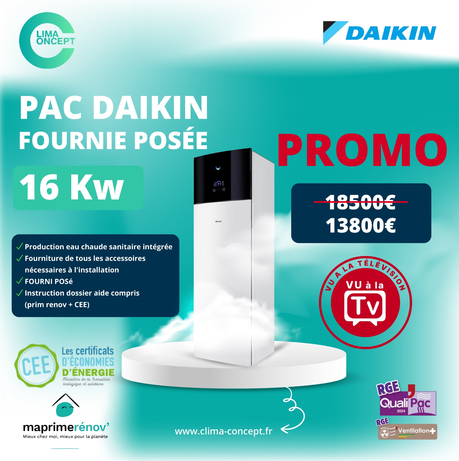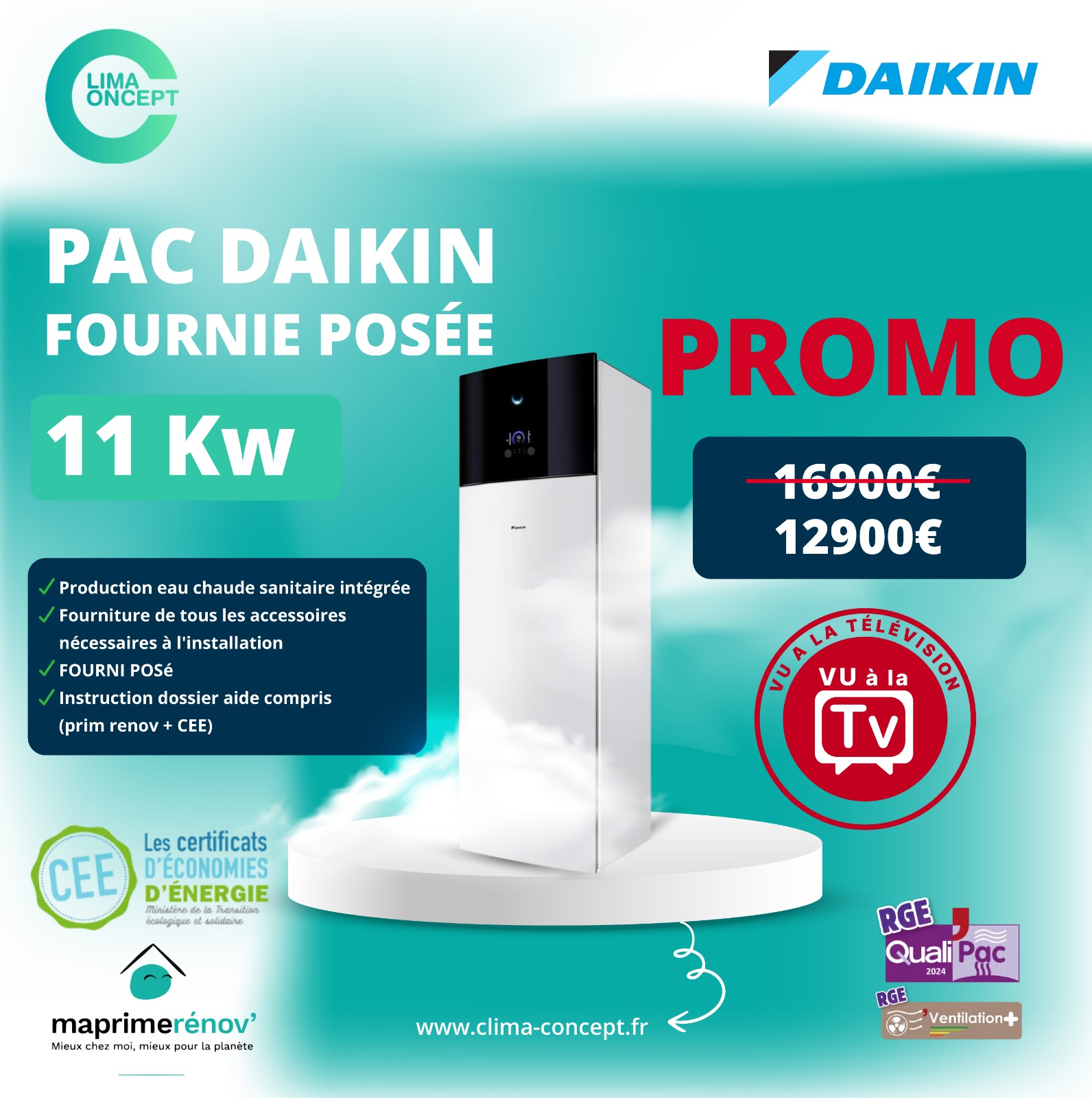 – Fourniture et pose du système complet d’une Pompe a chaleur DAIKIN 11kw avec Eau chaude sanitaire intégrée : 12 900€